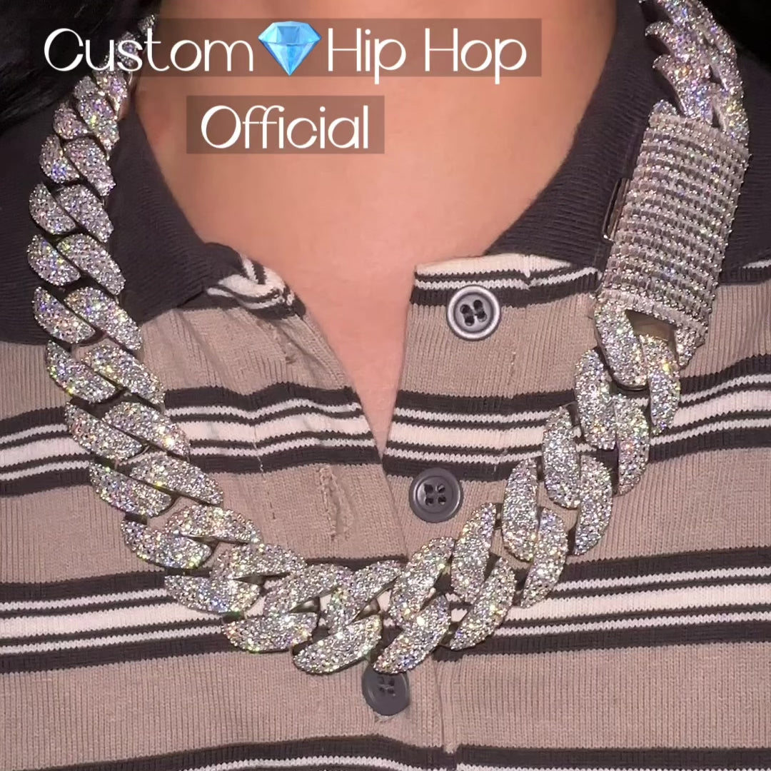 Elevate your style with our 23MM Moissanite Cuban Necklace, a standout piece in hip hop jewelry. Crafted from sterling silver and featuring VVS Moissanite stones that pass diamond tests, this iced out Cuban link chain comes with a GRA certificate and a luxurious gift box. Perfect for those who appreciate custom hip hop accessories with a touch of bling.