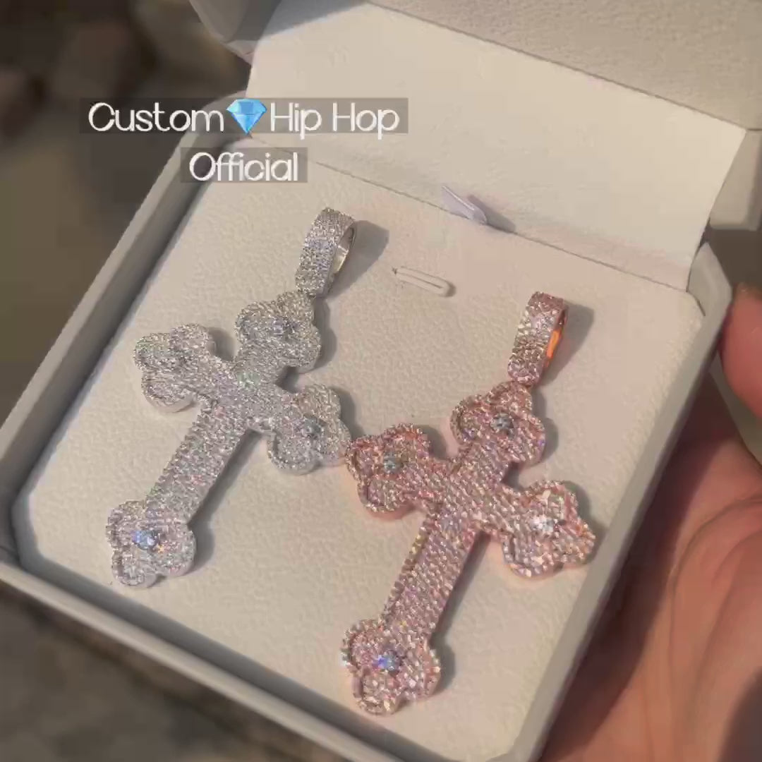Elevate your style with our VVS Moissanite Cross Pendant, a hip hop jewelry masterpiece crafted from sterling silver with rhodium and rose gold plating. This exquisite pendant boasts a GRA-certified main stone and is designed to pass diamond testers, ensuring its quality and brilliance. Ideal for adding a touch of luxury to any outfit, this pendant is a must-have for those who appreciate high-grade jewelry.