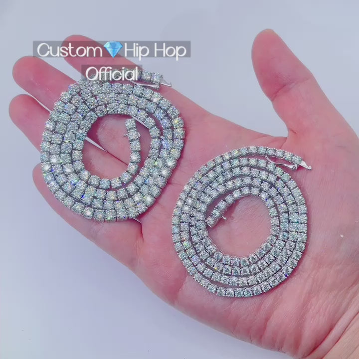 Elevate your style with our Tiffany Blue Green Moissanite Tennis Chain, a hip hop jewelry staple. Crafted from sterling silver with a rhodium plating, this chain features sparkling VVS Moissanite stones that pass the diamond tester. Available in widths of 3mm and 4mm and lengths from 18\" to 24\", it's the perfect blend of luxury and streetwear chic.