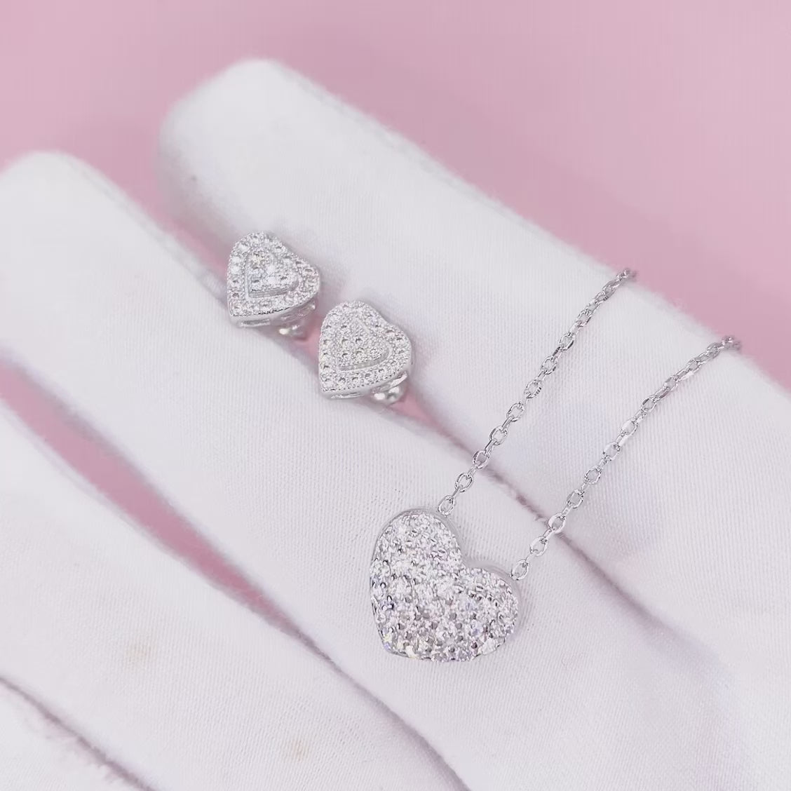 White Gold Solid Silver Iced Out Women Fashion Design Heart Moissanite Jewelry Set Necklace Earrings