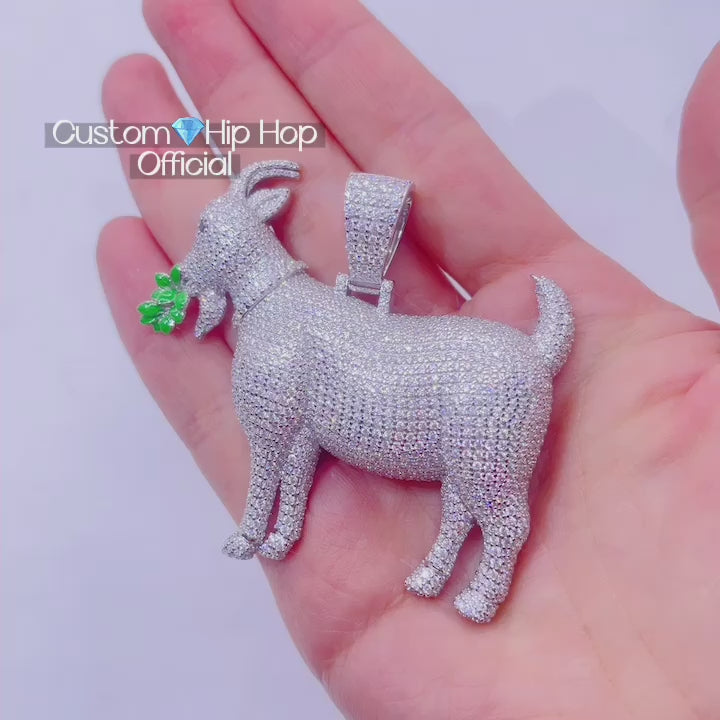 Elevate your style with this VVS Moissanite iced out goat pendant, a standout piece in hip hop jewelry. Crafted from sterling silver with an option of yellow or white gold plating, it's designed to pass diamond testers. Note: sold as a pendant only, chain not included.