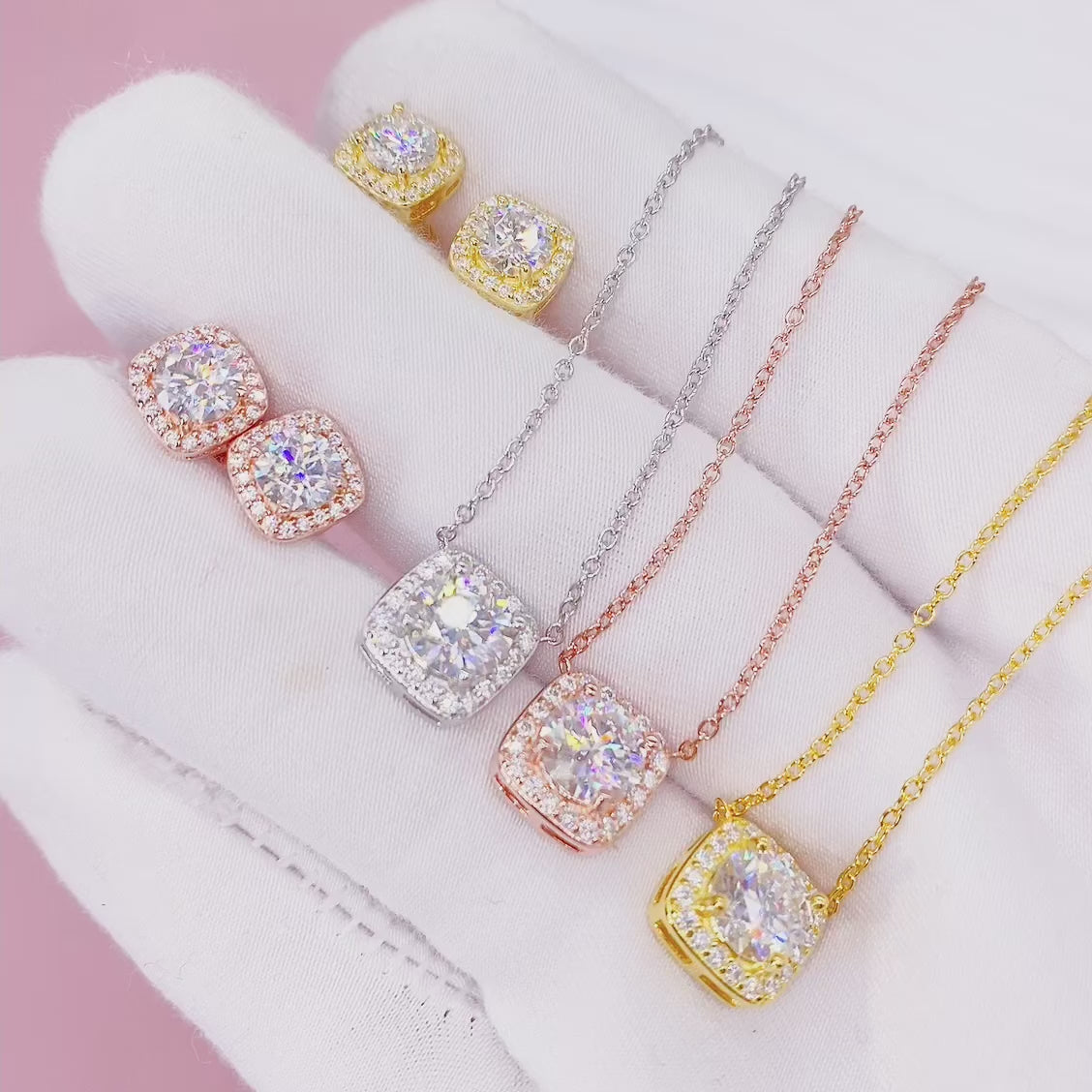 Classic Design Round Brilliant Cut Halo Diamond Style Necklace Earrings Set With Moissanite