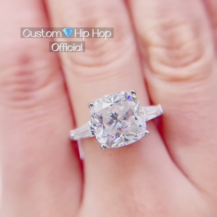 Elevate your style with this 5CT Cushion Cut Moissanite Silver Ring, a hip hop jewelry staple. Flaunting VVS clarity and white gold plating, it's the ultimate symbol of luxury for any wedding or special occasion.